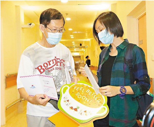 ■柴灣IVE教師到醫院向急需換肺續命的美蘭致送心意卡及支票,由勞父接收。