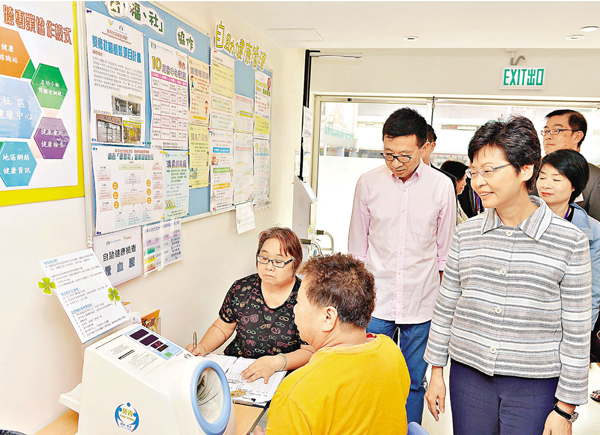 ■林鄭月娥昨日到訪葵青區,參觀社區重點項目設施、少數族裔支援服務中心等,並與區議員會面,就地區發展及民生事宜等議題交換意見。圖為林鄭月娥視察市民使用青葵中心的量血壓服務。