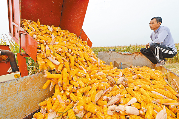 位於「渤海糧倉科技示範工程」項目區的河北省南皮縣,40萬畝玉米等秋糧近日開始大面積收穫。圖為農民在示範田內收穫玉米。■文 / 圖:新華社