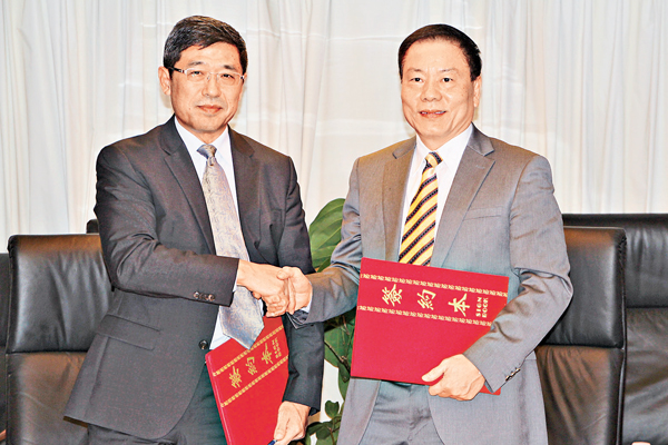■香港海通董事副總經理姜成義(左)及益華控股主席陳健仁簽約。 張偉民 攝