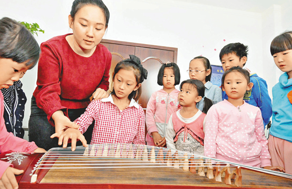 河北省邢台市橋東區三義廟社區,近日邀請邢台華藝音樂培訓機構的教師來到社區的「兒童之家」,為轄區的兒童講解古箏、吉他、葫蘆絲等樂器的演奏方法和相關知識,豐富孩子們的課外生活。圖為小女孩張佳欣在教師楊賽男的指導下感知古箏。 ■文 / 圖:新華社