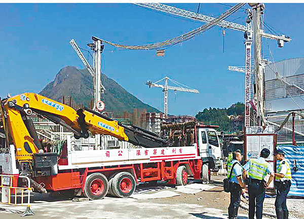 ■肇事吊臂車停在安達臣道地盤入口處,警方在現場調查意外肇因。
