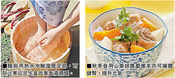 為配合較低氣溫,養生應調整生活作息。首先氣溫變冷正是人體陽氣收斂,陰精潛藏於內之時,夜長晝短,所以應比平常多睡一個小時,且夜涼勿憋尿,否則易誘發膀胱炎。其次,腳與上呼吸道黏膜有密切的神經聯繫,一旦腳部受涼,就會引起毛細血管收縮,人體抵抗力下降,因此做好足部保暖,可防止寒從足生。不妨每天睡前熱水泡腳30分鐘,改善血液循環,提高免疫力。而後在添衣保暖方面也有所講究,添衣不要太多、太快。秋天適度受些寒有利提高皮膚和鼻黏膜耐寒力,對安度冬季有益。但秋天早晚涼意濃時要多穿些衣服。秋季也是腹瀉多發季節,應特別注意腹部保暖。愛美女性秋涼後應盡量少穿露肩、露背裝,以免頸椎、腰椎受寒。但是穿蚚C色可選紅、橘、黃等顏色亮麗的衣服,產生活力、輕快的感覺,防止秋悲。最後,喜歡早上運動者,晨練要避開早霧,避免誘發慢性呼吸道疾病,建議選擇太極拳等舒緩運動。