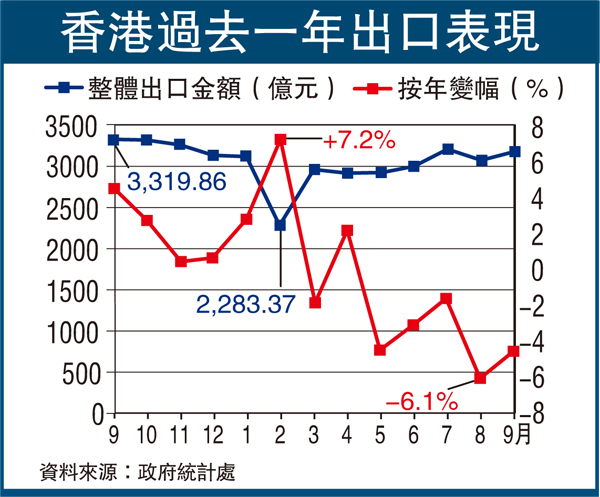 香港文匯報訊(記者 曾敏儀)繼8月本港整體出口貨值錄得6.1%的按年跌幅後,最新9月整體出口貨值再錄得4.6%的下跌,為連續第五個月下跌。9月整體出口貨值為3,167億元,其中轉口貨值3,132億元,下跌4.5%,港產品出口貨值則下跌至36億元,跌幅13.8%。同時,繼8月錄得7.4%的按年跌幅後,9月商品進口貨值為3,531億元,下跌7.6%。9月錄得有形貿易逆差364億元。