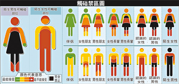 握手、拍膊頭和擁抱等身體接觸,往往被視為表達善意和拉近距離的做法,但並非所有人也喜歡被他人觸碰。牛津大學研究員近日製作出一張觸碰圖表,分析男女喜歡和不喜歡被碰的部位,反映與對方關係愈親密,可接受觸碰的部位便愈多;令人意外的是,男性願意讓陌生女性觸摸身體任何部位,相反對陌生男性除了手部以外幾乎全是「禁區」。
