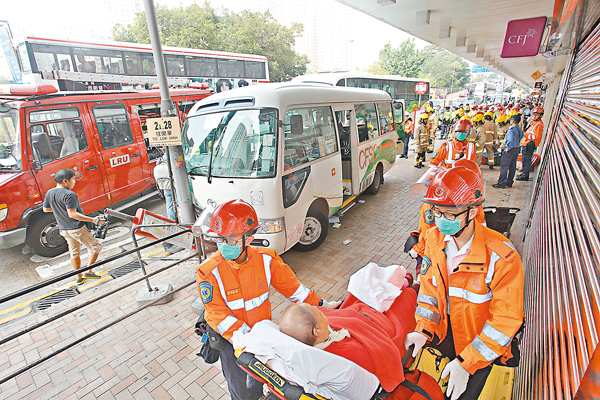 香港文匯報訊(記者 杜法祖)一輛復康巴士昨晨停在九龍灣牛頭角道淘大商場對開接載長者上車時,突遭一輛收掣不及的旅遊巴士從後猛撞,復康巴士飆前剷上行人路,連環撞毀巴士站牌及燈柱始停下,釀成15人受傷包括一名途人,其餘大部分為車上長者,猶幸無人重傷,警方正調查意外原因。