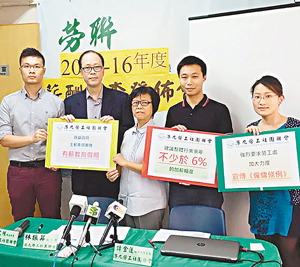 ■勞聯建議來年加薪幅度應不少於6%。右起:譚金蓮、林振昇、吳慧儀、周小松、黃文權。 陳敏婷 攝