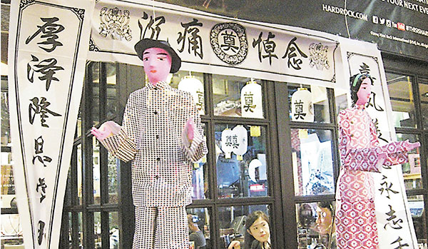 香港文匯報訊(記者 楊佩韻)每逢萬聖節晚上,蘭桂坊均雲集來自世界各地的猛鬼,搞鬼靈符滿佈天空,驚嚇骷髏隨時在你身旁。今日是萬聖節,位於蘭桂坊底層地舖「Hard Rock Cafe」今年萬聖節打破框框,門外掛起「紙紮公仔」,店內展示「奠」字大布,營造中式葬禮氣氛,成功吸引不少市民及旅客舉起手機拍照。發言人石啟兒表示,以往萬聖節以吸血鬼為主題已沒有驚喜,故打算以中式葬禮來個中西合璧,望帶動人流進場。