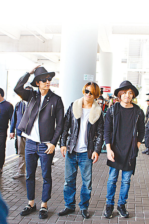 三子約於下午1時10分由香港國際機場的秘密通道步出,戴上太陽眼鏡及黑色帽子的橘慶太首先現身向粉絲揮手打招呼,緒方龍一及千葉涼平亦緊隨其後,緒方龍一同樣戴上黑超示人,十分有型,而千葉涼平則留有鬚根,更添成熟感。三子企定定讓傳媒拍照,又不時向粉絲微笑鞠躬問好,表現友善。眾粉絲甫見偶像即興奮尖叫,又大讚他們靚仔,眾人亦十分守秩序,現場未有出現混亂的情況。
