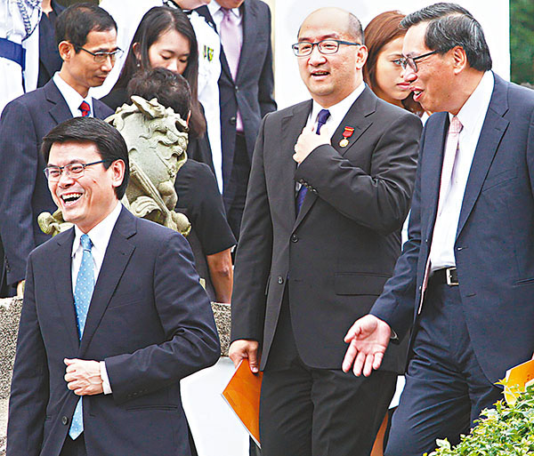 香港文匯報訊(記者 翁麗娜)違法「佔中」期間,特首梁振英曾公開讚揚時任警務處長曾偉雄的處理手法。昨日,曾偉雄獲頒授金紫荊星章,上台接受勳銜時全場掌聲雷動,歷久未停。曾偉雄認為,授勳是對他過去37年的警務工作,以及警隊同事努力的肯定,處理「佔領」工作只是「一小部分」。