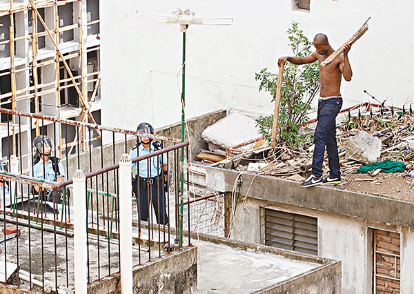 香港文匯報訊(記者 劉友光)一名以酷刑聲請留港的赤膊非洲漢,昨早危站旺角上海街一大廈天台,其間語無論次,不時拿起磚頭或木方揮舞,與警員對峙3小時,經消防、警方談判專家努力游說終情緒平伏,結束對峙送院檢查。