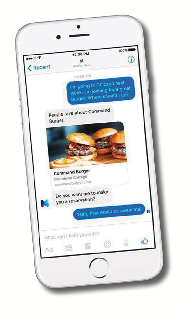 fb用戶未來只須按下fb即時通訊手機應用程式(app)Messenger底部的小按鈕,便能傳訊給M。M將自動分析用戶語言,在通訊欄詢問跟進問題,完成工作後再向用戶傳送更新資料。fb員工已進行幾周的內部測試,使用M籌辦派對或尋找美國新奧爾良少見的餐飲。