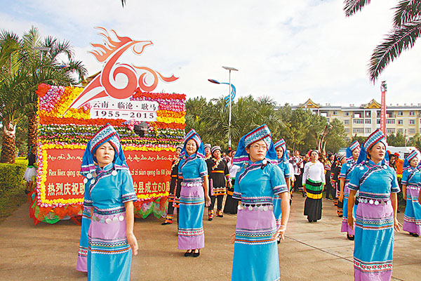 ■雲南耿馬縣慶祝60周年。圖為布朗族民眾花車巡遊。本報雲南傳真