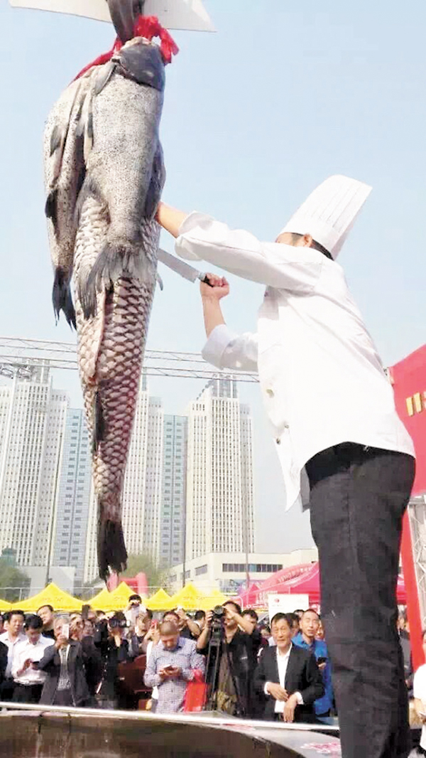 活動現場,161.2斤的魚王被吊車高高吊起緩緩下入直徑3.15米、深0.7米的「中原第一鍋」中。數百名市民在大鍋旁邊排起的長龍成了最惹眼的風景。