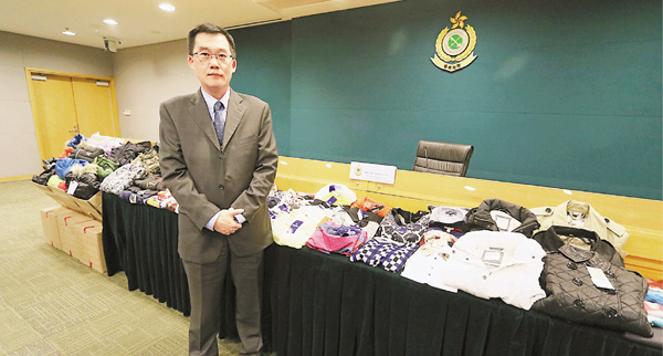 ■海關版權及商標一般調查組指揮官林由展示在樓上展銷場檢獲的冒牌貨。 劉友光 攝