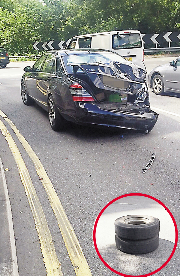 香港文匯報訊(記者 杜法祖)一輛平治S350L豪華房車,昨日上午11時許經城門隧道往荃灣,沿象鼻山路荃錦公路迴旋處途至石圍角h對開時,突飛來橫禍遭天降「孖轆」擊中車尾,「孖轆」繼而凌空越過平治車頭滾出迴旋處倒下,平治右車尾嚴重撞毀,幸車毀人無恙。警方懷疑有一輛至少3軸的重型車行駛途中甩輪後不顧而去,撿走「孖轆」追查涉事重型車下落。