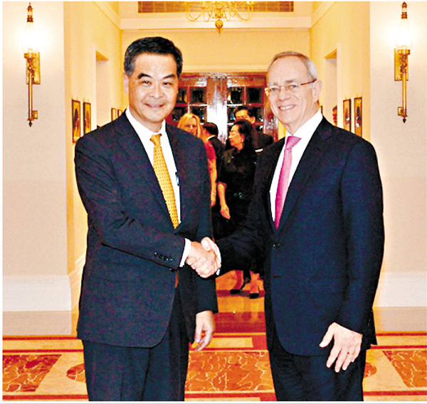 特首梁振英昨晚在禮賓府與訪港的麻省理工學院(MIT)校長Rafael Reif會面,雙方就教育、創新及科技議題交換意見,並歡迎該學院於香港設立創新中心。 ■記者 鄭治祖
