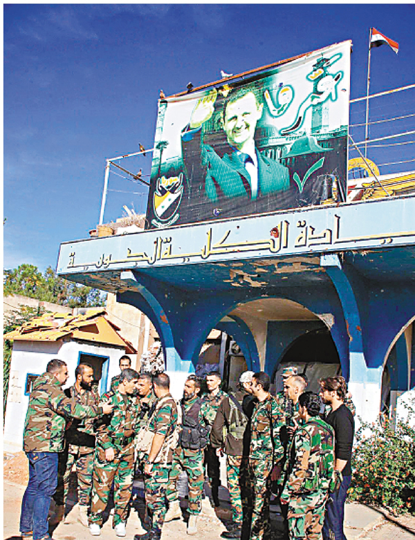 ■修憲建議沒把巴沙爾排除在外,歐美勢反對。圖為敘士兵在巴沙爾的海報下。 法新社