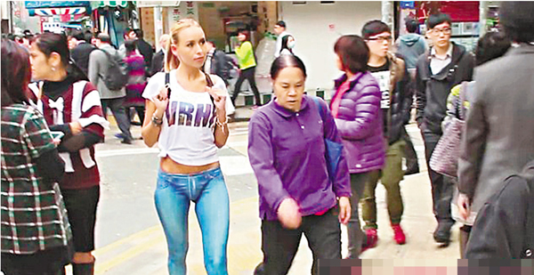 ■模特兒以人體彩繪方式,畫出像真度高的牛仔褲,全身只穿上T恤及背上金色背包,在本港鬧市遊走。 英國每日郵報截圖