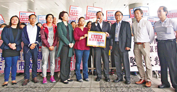 ■民建聯元朗支部昨日聯同近30名居民,到政府總部門外請願,要求特區政府盡快興建天水圍食環署街市及熟食中心。 黃偉邦 攝