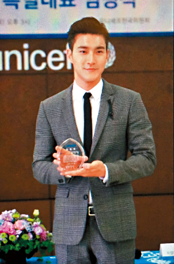 韓國人氣組合Super Junior成員崔始源昨日下午官仔骨骨,出席聯合國兒童基金會(unicef)韓國委員會特別代表的委任儀式,其所屬的經理人公司SM娛樂也派出高層出席儀式。始源接過委任狀,並簽下社會貢獻公約書,表示除自己外,亦會帶動SM其他藝人一起行善,而現場亦接蚍膝XSM眾星製作的unicef主題曲。及後,始源謂以前粉絲送禮物給自己時,他表示心意已足夠,反提議粉絲把禮物送給有需要的人,他特意趁這機會感謝粉絲的響應。