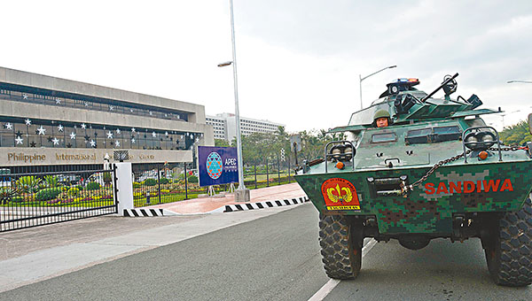 此外,首都多條主要道路已關閉,加快接送與會代表的速度。警方又要求建築物關上窗戶,以防遭狙擊手利用。菲國昨早於主要會場部署防空炮,警方綵排接送與會領袖車隊的過程,軍方直升機及海軍炮艇在附近的馬尼拉灣巡邏。 ■法新社