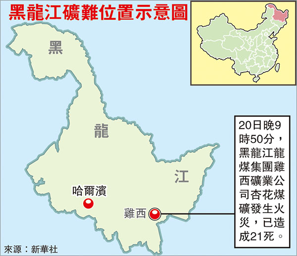 香港文匯報訊(記者 夏瑞雪 黑龍江報道)記者從黑龍江省安全生產監督管理部門獲悉, 20日晚9時50分,黑龍江龍煤集團雞西礦業公司杏花煤礦發生火災事故,已致21人遇難,1人失蹤,事故初步認定是大傾角皮帶起火引發火災。
