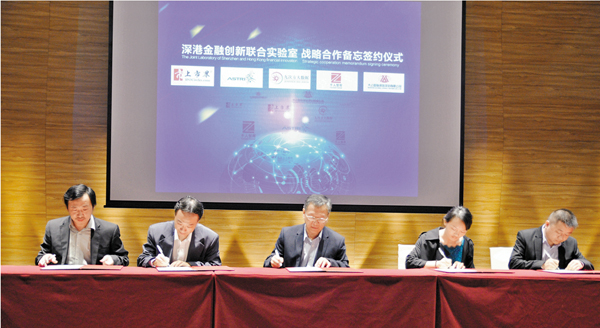 ■成立深港金融創新聯合實驗室簽約儀式近日舉辦。從左至右依次為:上市界簽約負責人張紀元、千人智庫簽約負責人雷志斌、香港應科院教授顏至宏、大公國際簽約負責人劉芳、九次方簽約負責人張傑。 記者李昌鴻 攝