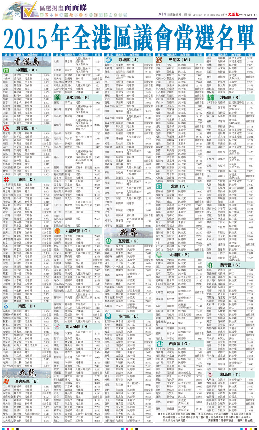 2015年全港區議會當選名單 (圖)