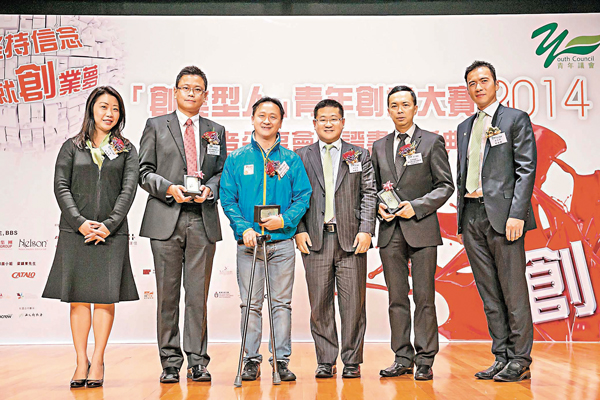 ■孫榮良(右三)為「創業型人」青年創業大賽的獲獎小組頒獎。