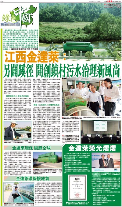 作為江西省重大生態文明工程,村鎮污水治理工程近年來以策應「綠色崛起」戰略為實施目標,全省統一謀劃、統一協調,依托金達萊FMBR兼氧膜污水治理獨創技術,形成了適用性廣、可複製性強的污水治理之「江西模式」。2014年10月,江西省省長鹿心社在江西金達萊環保股份有限公司調研考察時對金達萊依靠科技創新實現裂變式發展表示了讚賞。他續指,國家對環境保護高度重視,環保產業大有可為。