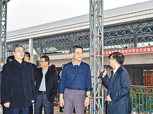 梁振英昨日上午繼續訪問廣東,包括到佛山市南海區佛山西站考察,了解鐵路和城巿交通發展,又到番禺的廣州南站參觀。他在facebook中指出,由該兩個站乘坐高鐵到香港,都是1小時以內,「內地的高鐵發展很快,十分方便。香港的高鐵要盡早與內地連接上,對擴大香港人未來的發展空間十分重要。」