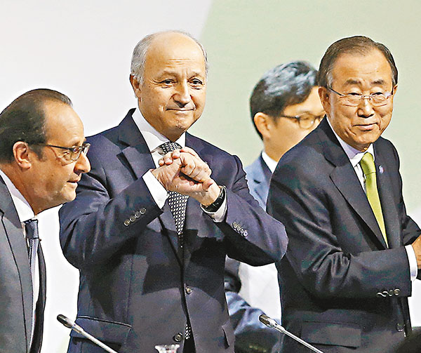 全球195個國家的代表在法國巴黎氣候變化大會經過2周商議後,協議最終草案文本終在昨日出爐,當中訂明全球氣溫升幅限制在攝氏2度以下,並首次爭取控制於1.5度內。大會主席、法國外長法比尤斯向各國提交長31頁的《巴黎協議》最終草案文本,指氣候協議將是抑制全球氣溫上升的「歷史性轉捩點」,形容為「目標遠大」同時體現公平、持久並具有法律約束力,在各主題上體現「共同但有區別的責任」及「各自能力」原則。