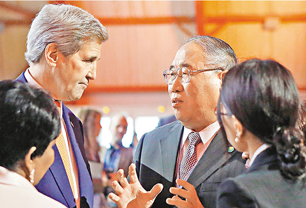 ■中國代表解振華(右)與美國國務卿克里交談。 美聯社