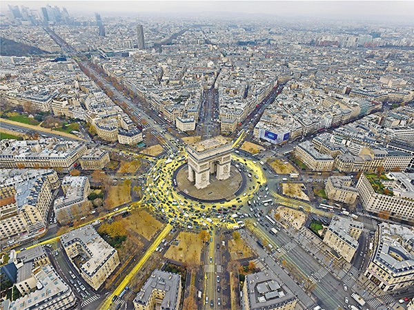 各大環保組織在巴黎氣候大會完結前,盡最後努力表達訴求,其中綠色和平成員在圍繞巴黎凱旋門的戴高樂廣場上,倒下黃色油漆,令整個廣場從高空看變成一個太陽,藉此敦促法國總統奧朗德加快應用太陽能等再生能源,部分成員更吊在凱旋門上展示標語。警方拘捕部分示威者。