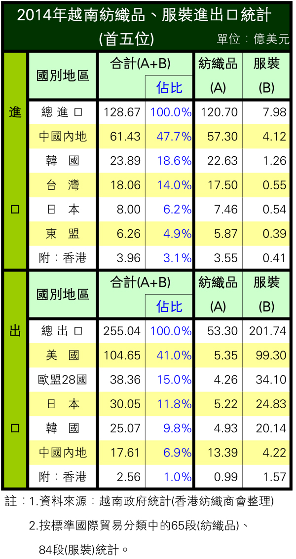 ¾Ú¶V«n¬F©²²Îp¡A2014¦~¯¼¦ç¥X¤f¬°255.04»õ¬ü¤¸¡A¨ä¤¤¹ï¬ü°ê¥X¤f¦û41%¡B¼Ú·ù¦û15%¡B¤é¥»¦û11.8%¡A¤T¤j¥«³õ¦X¦û¨ä¥X¤fÁ`ÃBªñ¤C¦¨¡C±q¤jÃþ¬Ý¡AªA¸Ë»P¯¼Â´«~¤§¤ñ«h¬°80¡G20¡A¤Ï¬M¶V«n¯¼¦ç¶T©ö¹ê¬O¶i¤fì®Æ¥b¦¨«~¥[¤u¦¨¦ç¥X¤fªº¼Ò¦¡¡C¦P¦~¶i¤f¯¼¦çÁ`ÃB¬°128.67»õ¬ü¤¸¡A¨ä¤¤¦Û¤¤°ê¤º¦a¶i¤f¦û47.7%¡A¨ä¦¸¬OÁú°ê¤Î¥xÆW¡A¤À§O¦û18.6%¤Î14%¡C°ò¥»¤W³£¬O¥[¤u¥Îªº¯½¡B¥¬Ãþ¯¼Â´«~¡]¸Ôªþªí¡^¡C