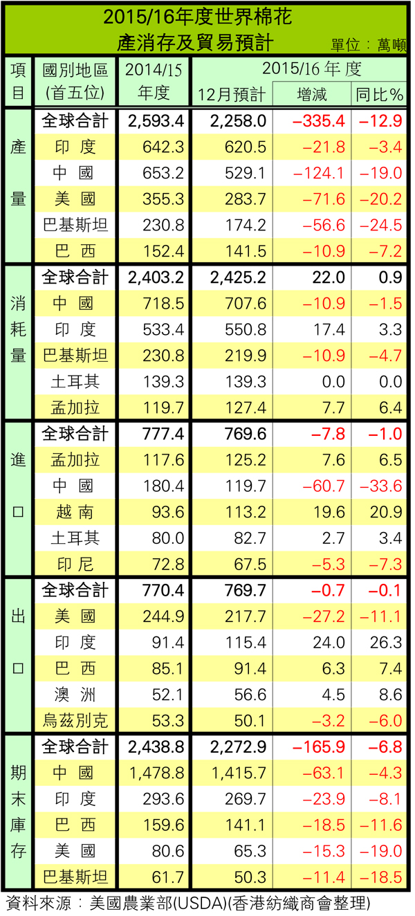 據美國農業部(USDA)十二月最新發表的2015/16年度世界棉花產銷統計,與2014/15年度相比,產量2,258萬噸減335.4萬噸、消耗2425.2萬噸增 22萬噸,消大於產;但進、出口貿易量均約為769.7萬噸減約4.3萬噸,期末庫存 2272.9 萬噸,雖較上年度最高2,438.8萬噸減少,但仍處多年來的次高水平(詳附表)。