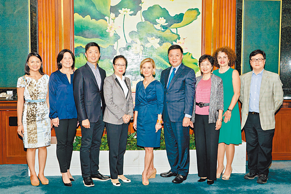 ■美國服裝鞋業協會(AAFA)行政總裁 Juanita Duggan女士(中)率領該會其他高層人員,來港籌備「2015香港峰會」。10月28日與香港紡織商會會長蕭盧慕貞(左四)聯同永遠榮譽會長陳亨利(右四)、嚴震銘(左三)、常務副會長兼秘書長林偉豐(右一)和副會長宋敏之(右三)會晤,探討促進兩會交流合作。