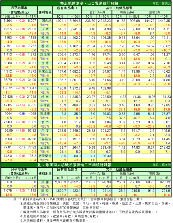 所有商品總出口:鄰近17個國別地區(以下簡稱"整體"),十月單月出口減幅擴大至約9.6%,首十月累計減6.4%。其中跌逾一成的有印度、新加坡、印尼、馬來西亞(減14.0%至16.7%),增長的只有澳門、柬埔寨、越南、及孟加拉(詳見附表)。
