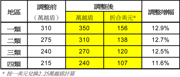 根據越南政府於十一月中正式發布的公告,該國最低工資標準將由2016年1月1日起作出調整,平均上升12.4%。按新規定,明年越南各地區別的每月最低工資標準(見圖)。