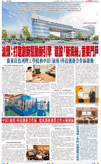 12月16日,一直敢為人先的廣東汕頭,將隆重舉行廣東以色列理工學院和中以(汕頭)科技創新合作區啟動儀式,全面深化汕頭與以色列的創新發展合作,這是汕頭實施創新驅動戰略,建設21世紀海上絲綢之路重要門戶的又一新引擎。廣東以色列理工學院和中以(汕頭)科技創新合作區將與我國目前唯一面向海外華僑華人的改革創新試驗區-華僑試驗區一起,成為汕頭創新驅動戰略的「兩翼」,引領汕頭新特區振翅騰飛。■香港文匯報記者 謝白清