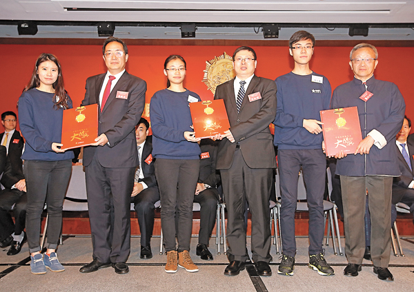 ■宋如安(右三)、馮瑛冰(左二)、龔仁心(右一)向本港大學生代表致送畫冊。 潘達文 攝