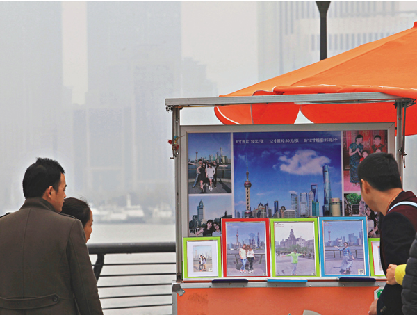 ■昨日,上海發佈空氣重污染黃色預警,啟動Ⅲ級響應措施。外灘天空已被霧霾籠罩,遊人稀少。 中新社