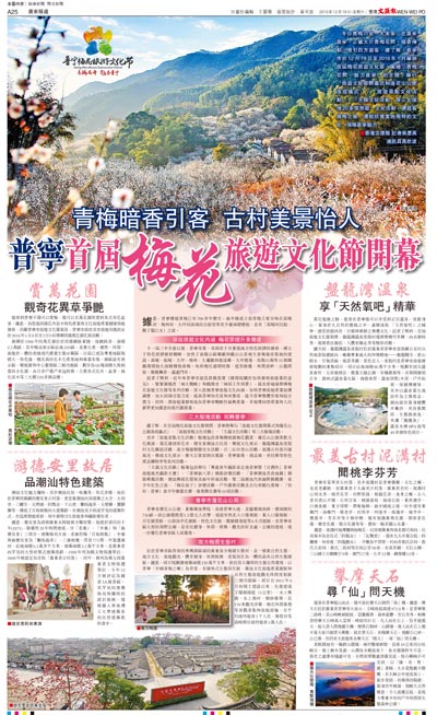 冬日賞梅乃是一大美事。在廣東普寧,正值大片青梅花開,暗香傳動,吸引四方遊客。據了解,普寧市於12月19日至2016年1月舉辦首屆梅花旅遊文化節,圍繞「青梅花開,魅力普寧」的主題,舉行「旅遊文化節開幕式和蓮花山公園落成儀式」、「旅遊景點文化活動」、「主題文化活動」等三大版塊20多個旅遊、文化活動,讓遊客賞梅之餘,還能欣賞當地獨特的文化,領略普寧魅力。■香港文匯報 記者吳彥英、通訊員高壯波