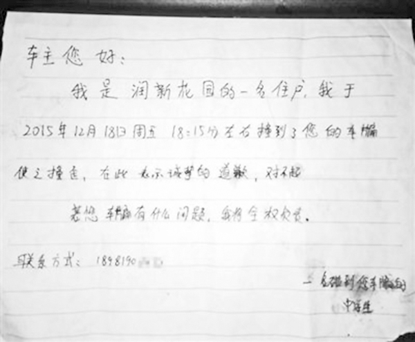 事情發生在12月18日。柏宇表示,當天下午她走到小區門口時,一不留神撞到了旁邊一輛轎車的車頭後,發現轎車車牌面板被撞彎了。隨後,她寫了一張字條並把字條貼到了轎車擋風玻璃上:「車主您好,我於2015年12月18日周五18時15分撞到了您的車牌,使之撞歪,在此表示誠摯的道歉。若您的車牌有什麼問題,我將全權負責」,並留下了手機號碼。
