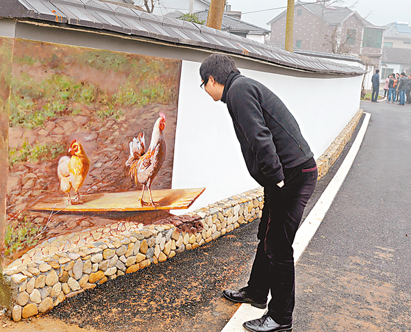 近日,浙江省安吉縣靈峰街道橫山塢村邀請專業設計製作團隊駐村創作3D藝術畫,一幅幅栩栩如生、富有鄉土氣息的3D作品躍然牆上,藝術主體與鄉村景物相映成趣。圖為遊人昨日在橫山塢村欣賞3D藝術畫。 文/圖:新華社