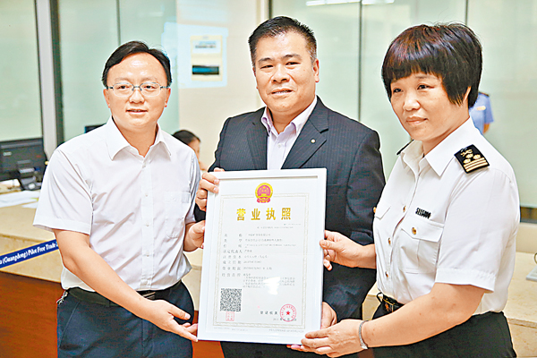 ■南沙率先啟動全國海關進出口企業登記「一照一碼」改革,企業代表從工作人員手中接過首個一照一碼的營業執照。