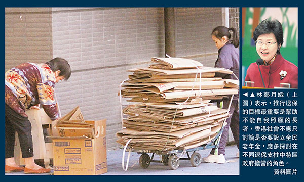 香港文匯報訊(記者 鄭治祖)香港人口加速老化,退休保障問題備受社會關注,扶貧委員會日前公佈退休保障諮詢文件,諮詢期6個月,就如何改善香港退休保障制度,收集市民意見。政務司司長、扶貧委員會主席林鄭月娥表示,推行退保的目標最重要是幫助不能自我照顧的長者,香港社會不應只討論是否要設立全民老年金,應多探討在不同退保支柱中特區政府擔當的角色。她又指,社會未來必須探討如何增加特區政府收入,應付未來人口老化需要。
