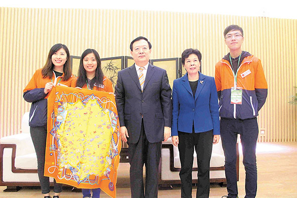 ■夏寶龍向未來之星代表團學生贈送印有「浙江文化地圖」的絲巾 。 周方怡 攝