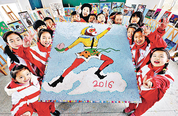江西省德興市海口小學的留守兒童,在老師的指導下,用1萬多枚五顏六色的紐扣,拼出了一幅邊長為120厘米的「金猴駕雲」進入2016年的圖畫。 文/圖:中新社